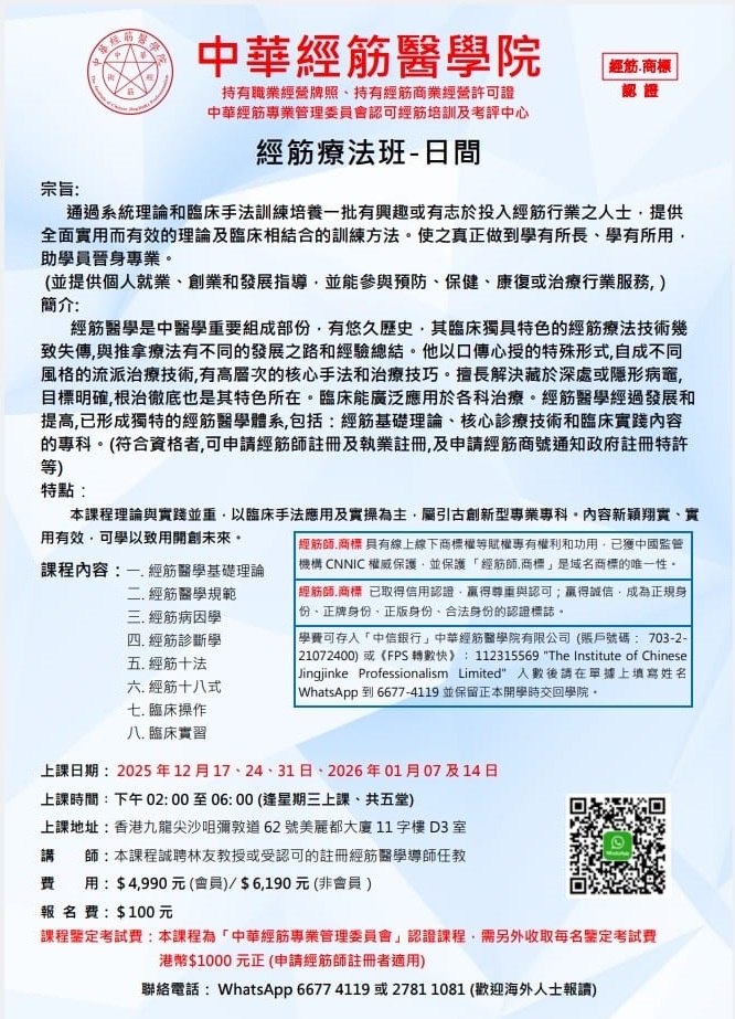 經筋療法證書課程(日間)COURSE INFORMATION